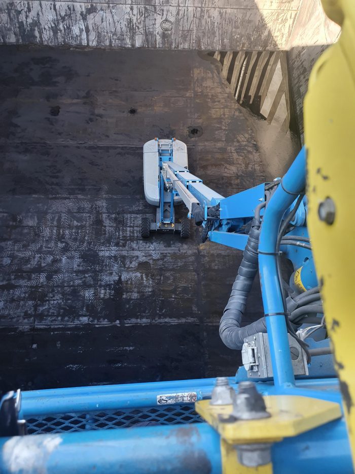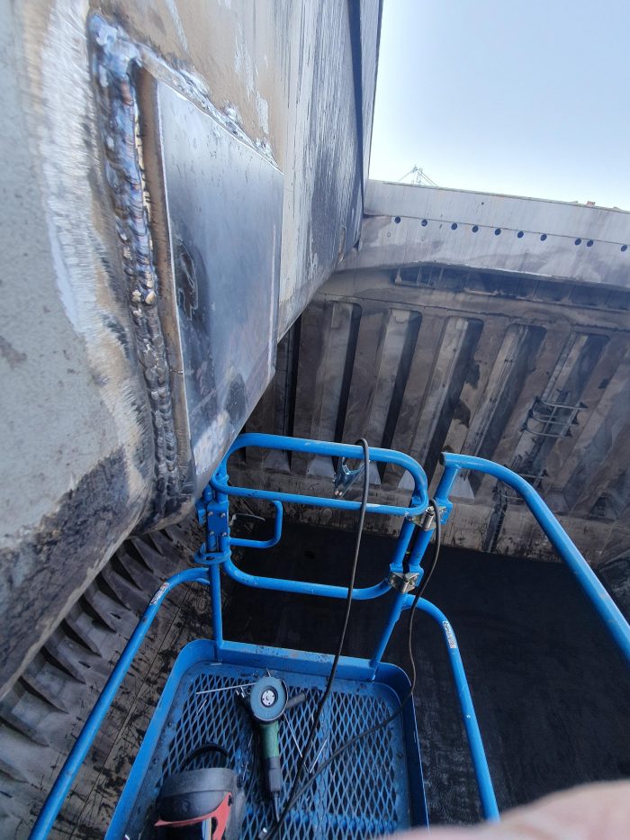 Idag blev vi lite högre uppsatta. Provisorisk lagning av en oljetank i en båt, 22 meter i luften! Under dessa förhållanden går det i regel att få en godkänd skarv, men det där snygga finliret blir däremot svårare!